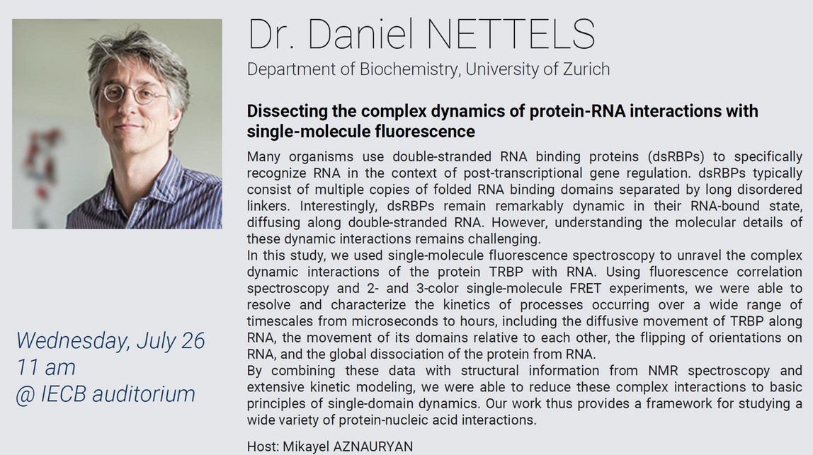 IECB seminar by Dr Daniel Nettels, Department of Biochemistry, University of Zurich, Wednesday July 26 at 11 a.m.