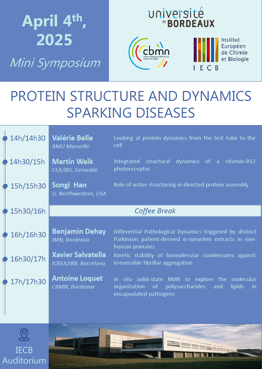 Un séminaire intitulé « Protein Structure and Dynamics Sparking Diseases » aura lieu le 4 avril à 14 heures à l'IECB.