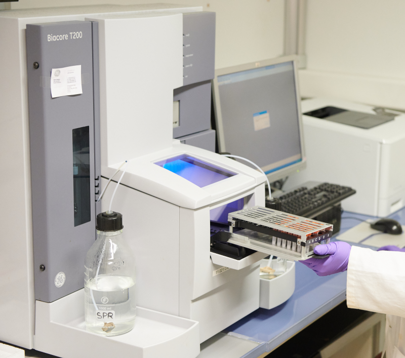 La plateforme dispose d'un Biacore T200 permettant des expériences de SPR (Surface Plasmon Resonance) soit l'analyse sans marquage d'interactions moléculaires en temps réel. Pour cela, l'un des partenaires d'interaction est immobilisé sur une biopuce, de manière covalente ou non, tandis que l'autre partenaire est mis en contact via un dispositif capillaire microfluidique utilisant un flux de tampon en continu. Cet instrument à ultra-haute sensibilité permet de déterminer avec précision les taux d'association (kon) et de dissociation (koff) entre biomolécules.